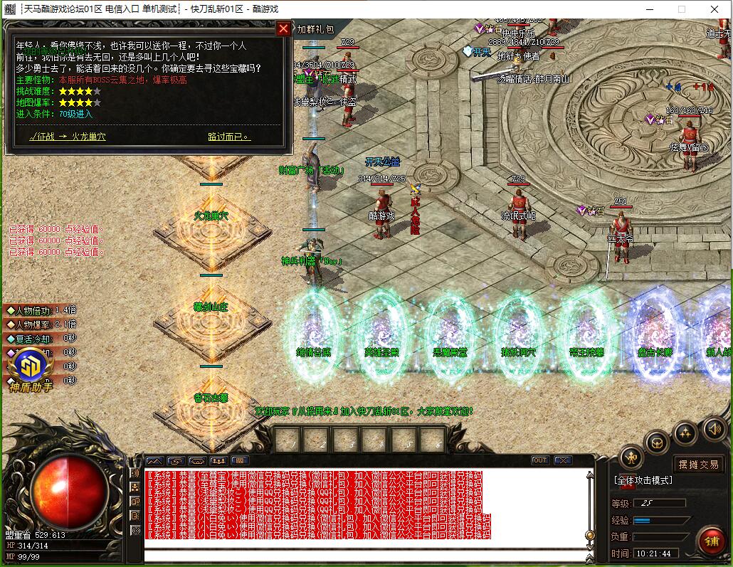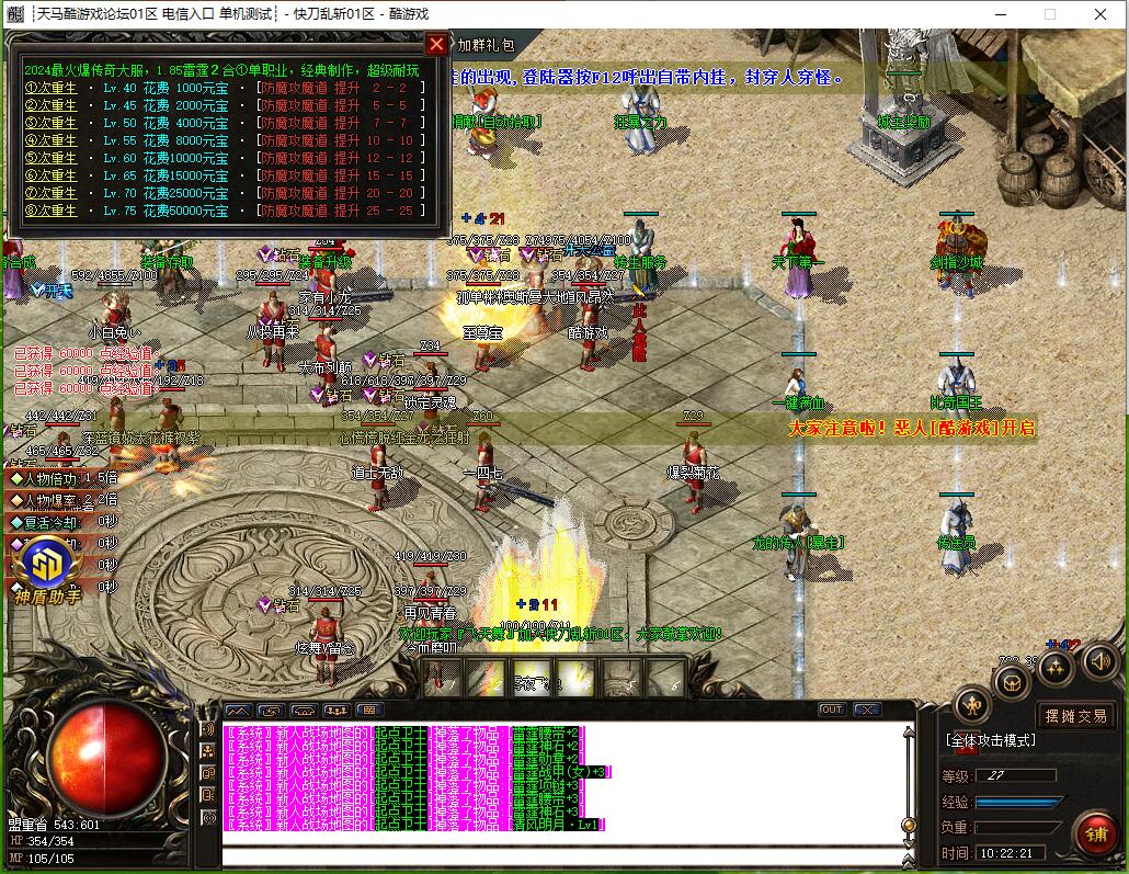 全民火龙单职业微变版本,纯散人服不花钱也可终极,一切靠打无合成,散人打金地图多怪物刷新速度快,装备货币保值,每日人品大爆发轻松300+收入。每天稳定四区开放(10:30 14:30 18:30 22:30),每个地图终极福利BOSS每晚22:01刷新,首区攻沙奖励RMB 588无封顶。市场最强封挂系统24小时接受举报,提醒设置二级密码防扫号。适度游戏益脑,拒绝盗版,享受健康生活。
