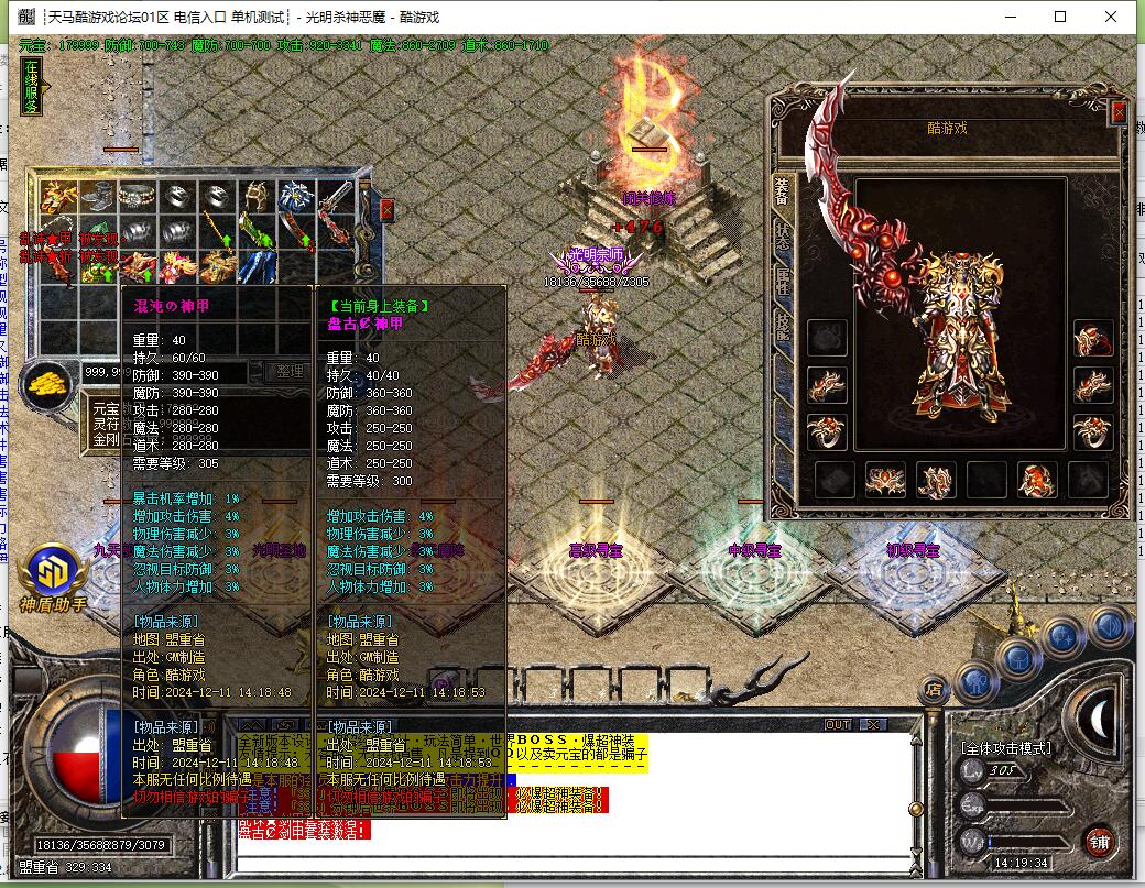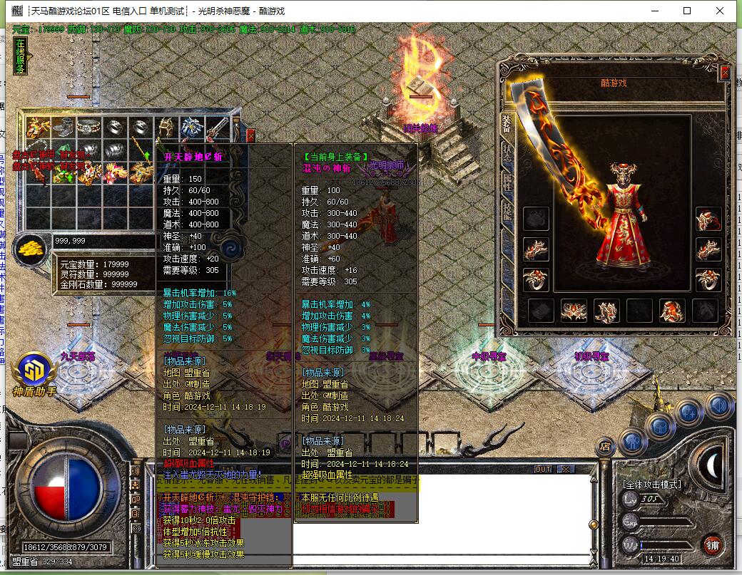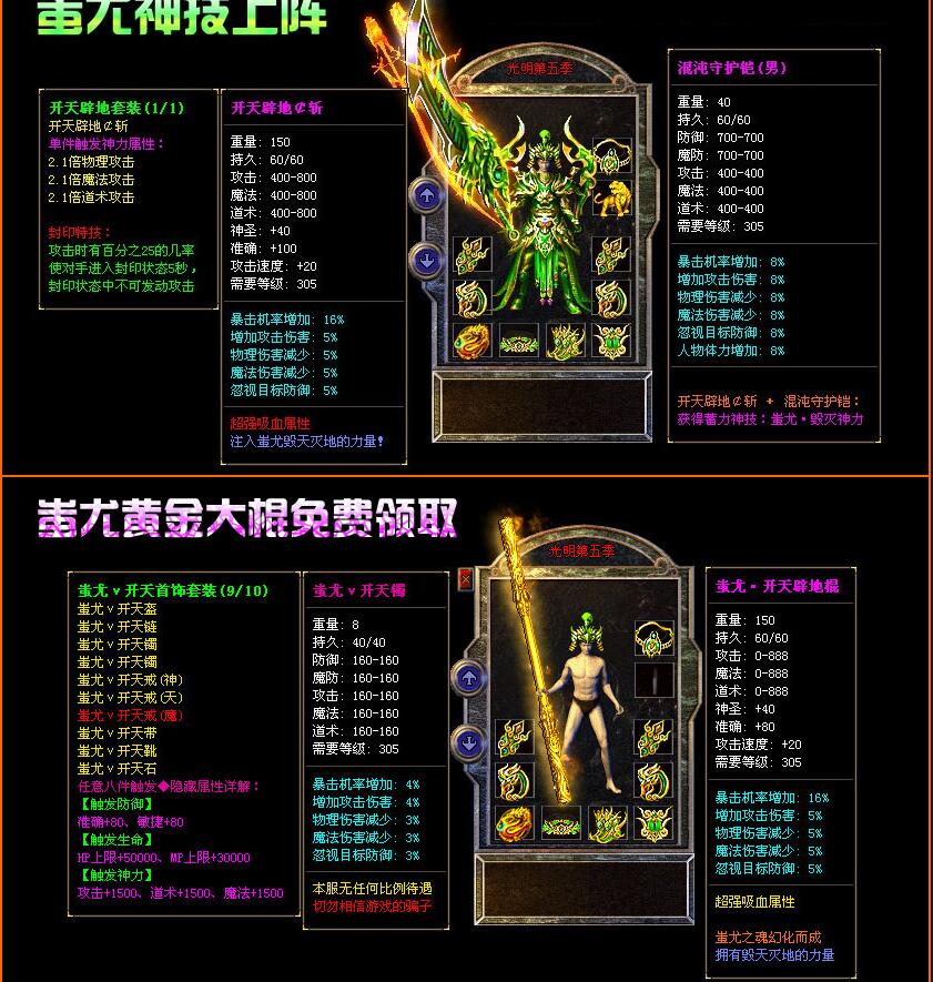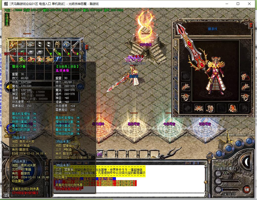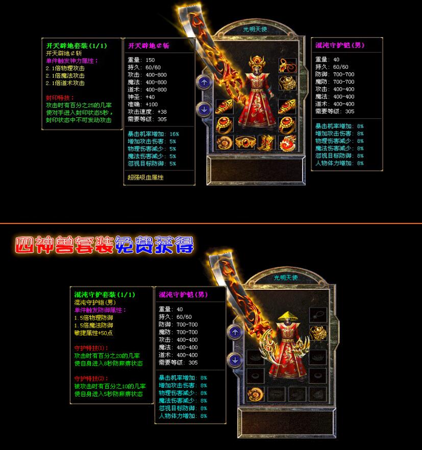 装备说明:散人好混,元宝恶魔币装备好打,所有装备游戏全爆,自带元素,威力十足。