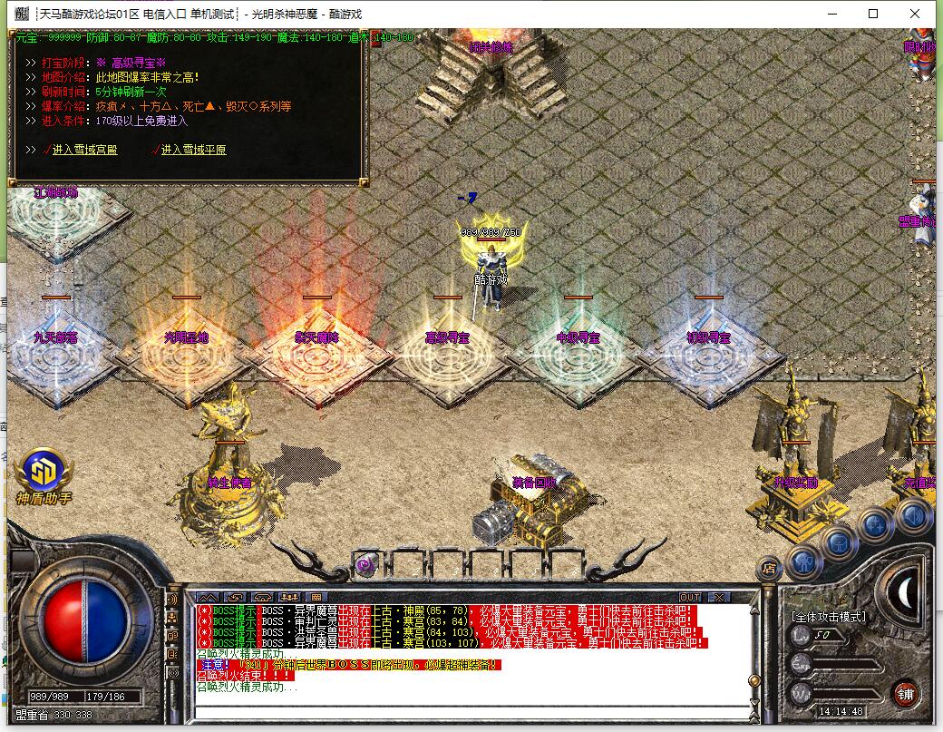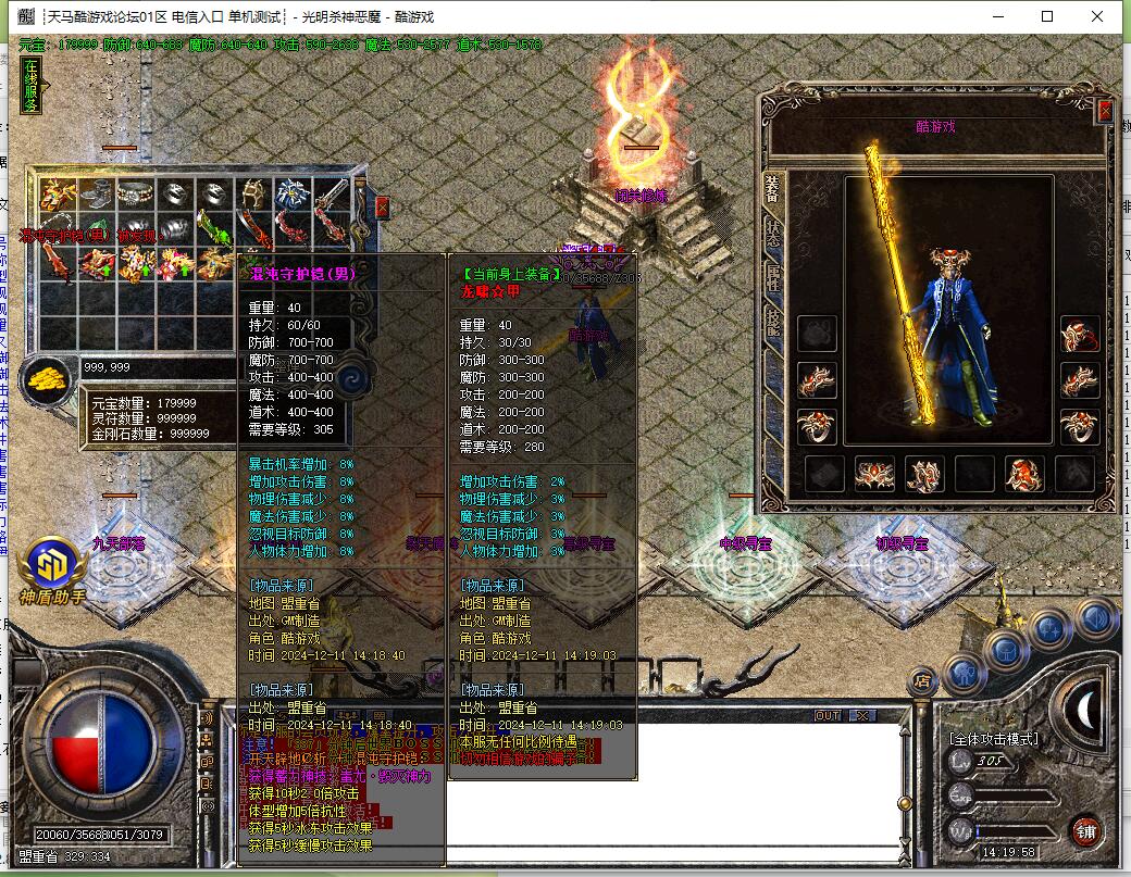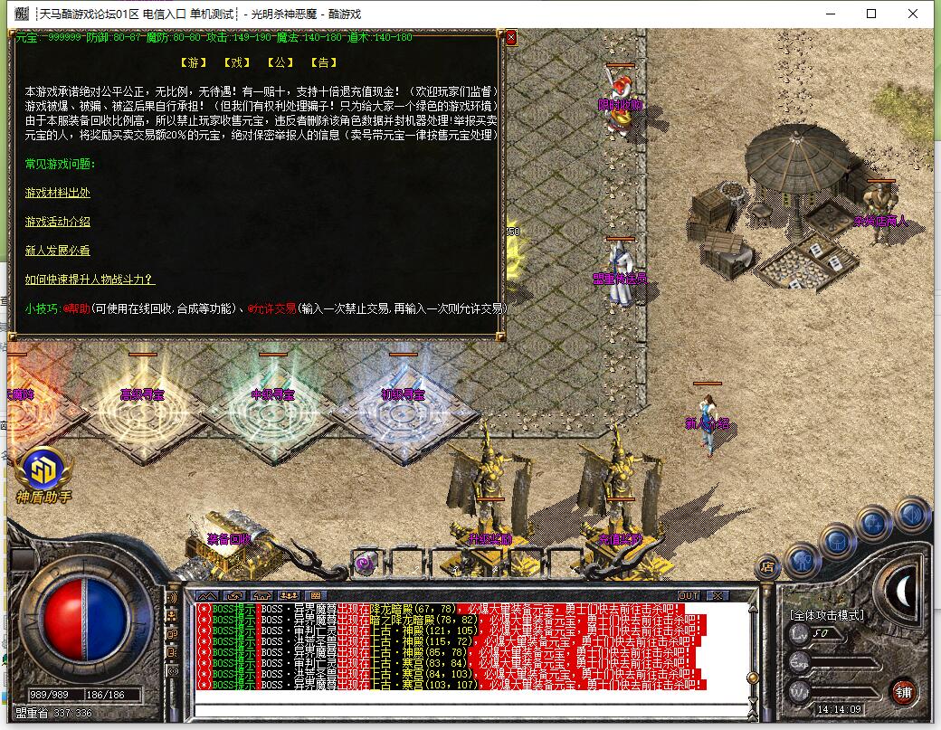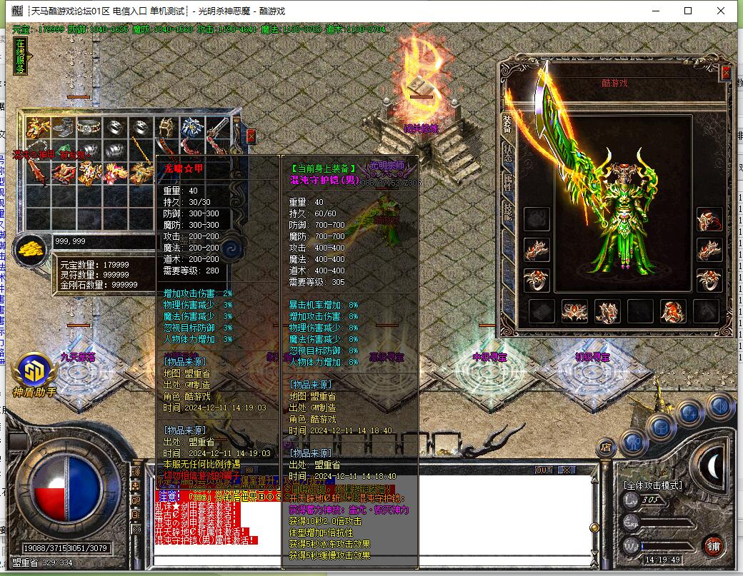 装备说明:散人好混,元宝恶魔币装备好打,所有装备游戏全爆,自带元素,威力十足。