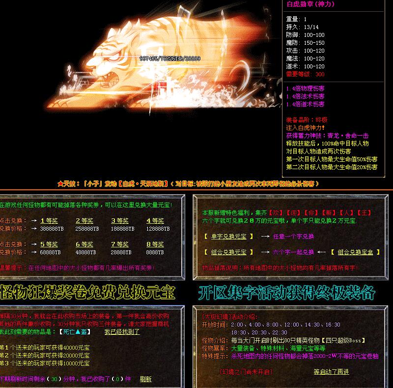 - 海量广告宣传,保证人气火暴!新区第二天晚上首次攻沙奖励1500万元宝,老区奖励800万元宝。