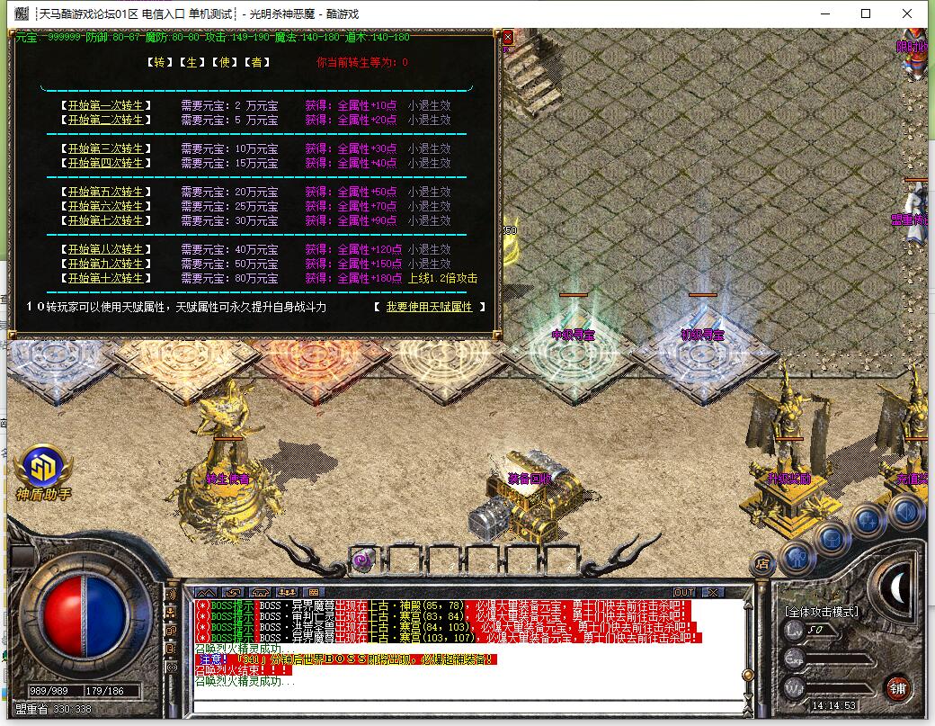 - 增加10转以后可以使用天赋属性,天赋属性永久提升自身属性,通过击杀蚩尤之魂还可以提升到5级天赋!