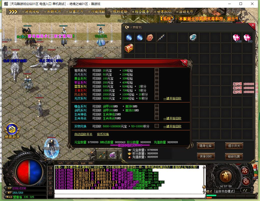 本服还原干净聊天框,无垃圾信息及回收提示,商铺不售材料全靠打怪,永久回收物品均由怪物爆出。游戏问题可QQ群联系客服完美解答,无论是否消费均用心服务,所有玩家公平对待。交易安全需通过商铺RMB点交易,提现手续费仅10%;私下交易一经查实封号并清除提现记录;禁止自动刷屏、骂人小号占安全区,违者警告或封号;严禁加速脱机外挂,发现必删永不解封。