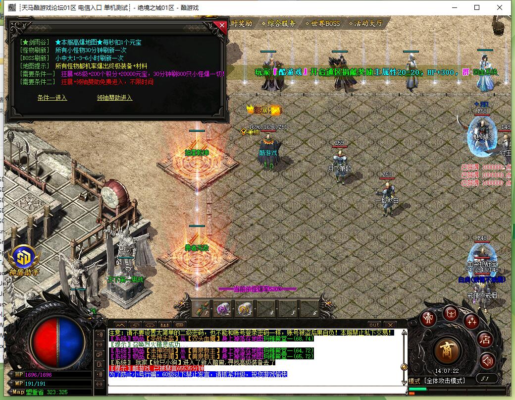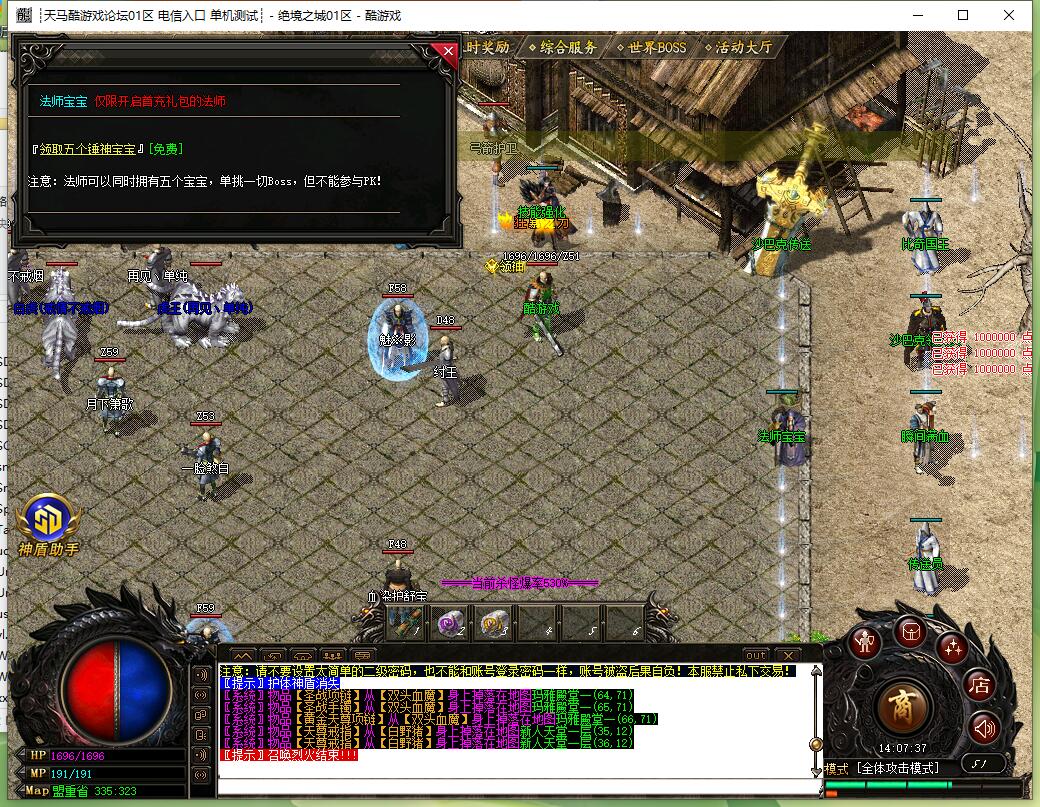 全民火龙单职业微变版本,纯散人服不花钱也可终极,一切靠打无合成,散人打金地图多怪物刷新速度快,装备货币保值,每日人品大爆发轻松300+收入。每天稳定四区开放(10:30 14:30 18:30 22:30),每个地图终极福利BOSS每晚22:01刷新,首区攻沙奖励RMB 588无封顶。市场最强封挂系统24小时接受举报,提醒设置二级密码防扫号。适度游戏益脑,拒绝盗版,享受健康生活。