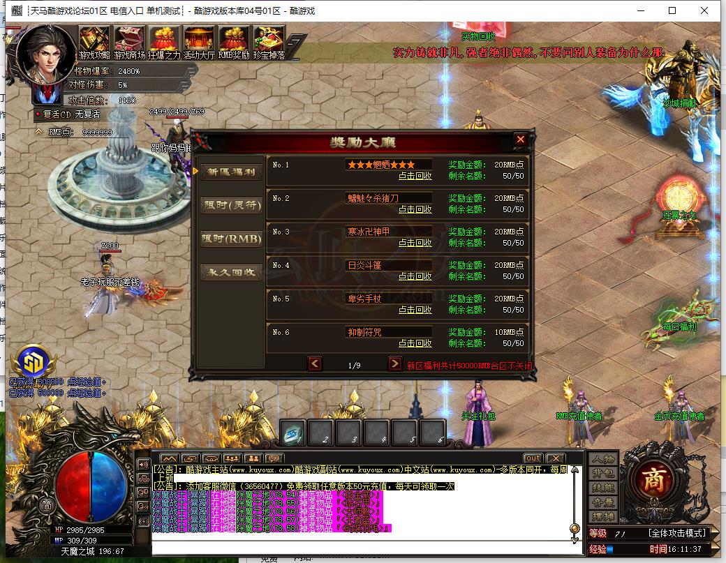 - 7:全民闯关→开区四小时后举行,分为5层,全民参与,击杀相对应层数里的所有怪物进入下一层,每过一层都有奖励。到达5层奖励RMB点。(需要齐心协力)
