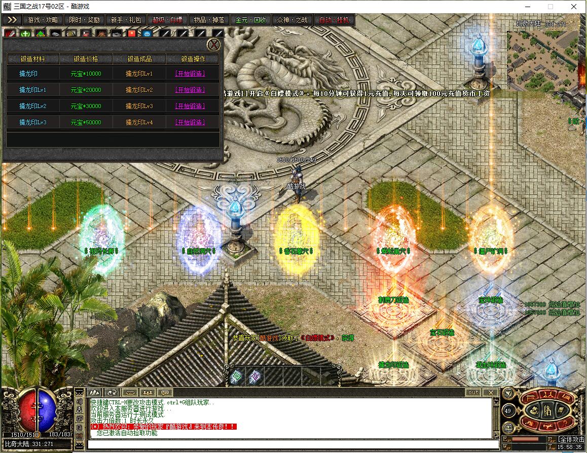 战士彻地钉,法师流行火雨、群雷,道士群毒、飓风破。
