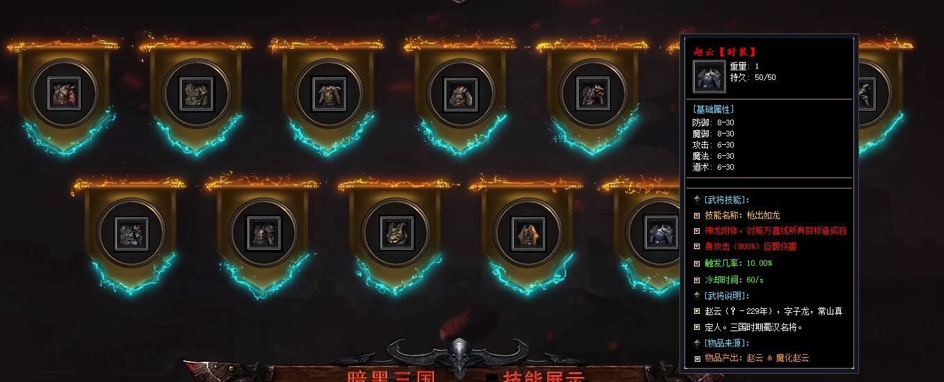 18个三国武将,每个附带专属技能,由专属怪物爆出。