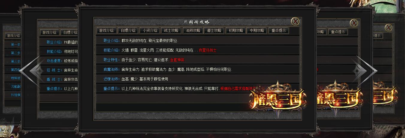 传奇手游三职业特色鲜明:战士叠刀增伤吸血减伤(攻速上限30,每1点攻速=1层叠刀,切割+吸血+伤害抵抗);法师无情的刷怪机器(10级群雷11X11范围,无CD流星火雨,高施法速度);道士宝宝契合度系统(初始50%攻击契合度,双防契合度120%,生命契合度150%,宝宝享人物防御/魔域/生命/道术加成)。新手上线需领取任务列表,召唤宠物(商场购买,每级+1全属性上限50级),左上角功能含智能挂机、宝石合成、自动喝药等。比奇城30级内可免费召唤虎卫,独家技能战士十方斩(2X2 AOE 5%吸血)、法师幽冥龙炎(8X8 AOE 15秒CD推怪)、道士阴阳法环(魔法盾)优先获取。一大陆比奇:野外怪掉极品装备(整套+50%经验),鸡王爆鸡王剑(战士神器),兽王甲(挂机回血蓝),僵尸洞小怪掉技能书页(3-4级成功率100%,9级技能触发神秘称号),装备强化分极品(+7卷轴,触发称号最高+60伤害)、星星(88星每2星+0.01倍攻击)、宝石(5级合成,NPC打孔1大陆3孔2大陆5孔),称号收集(BOSS材料、特殊装备、灭世者得群攻技能/元素属性),转生系统(一二三转,三转进二大陆强制),专属神器(沃玛/祖玛兑换,元宝激活)。二大陆土城:幻境每2小时开放20分钟(幻3-4刷金最快,幻10打boss点最快),特戒(麻痹/复活/隐身/技能等6个搭配),生肖(12种特效,幻境使者掉落,合成地级),战马BUFF(精英/首领掉落,洗练品质特效)。小提示:祖玛装备存NPC打孔(3孔赚),一大陆统治者称号(BOSS点+1),蜈蚣洞死亡棺材刷钱快,幸运9点以上每点+0.01攻击,比奇东门世界BOSS(法师道士无伤)。