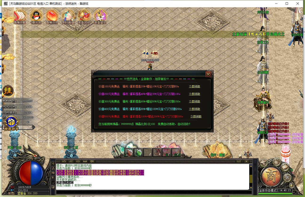 全民火龙单职业微变版本,纯散人服不花钱也可终极,一切靠打无合成,散人打金地图多怪物刷新速度快,装备货币保值,每日人品大爆发轻松300+收入。每天稳定四区开放(10:30 14:30 18:30 22:30),每个地图终极福利BOSS每晚22:01刷新,首区攻沙奖励RMB 588无封顶。市场最强封挂系统24小时接受举报,提醒设置二级密码防扫号。适度游戏益脑,拒绝盗版,享受健康生活。