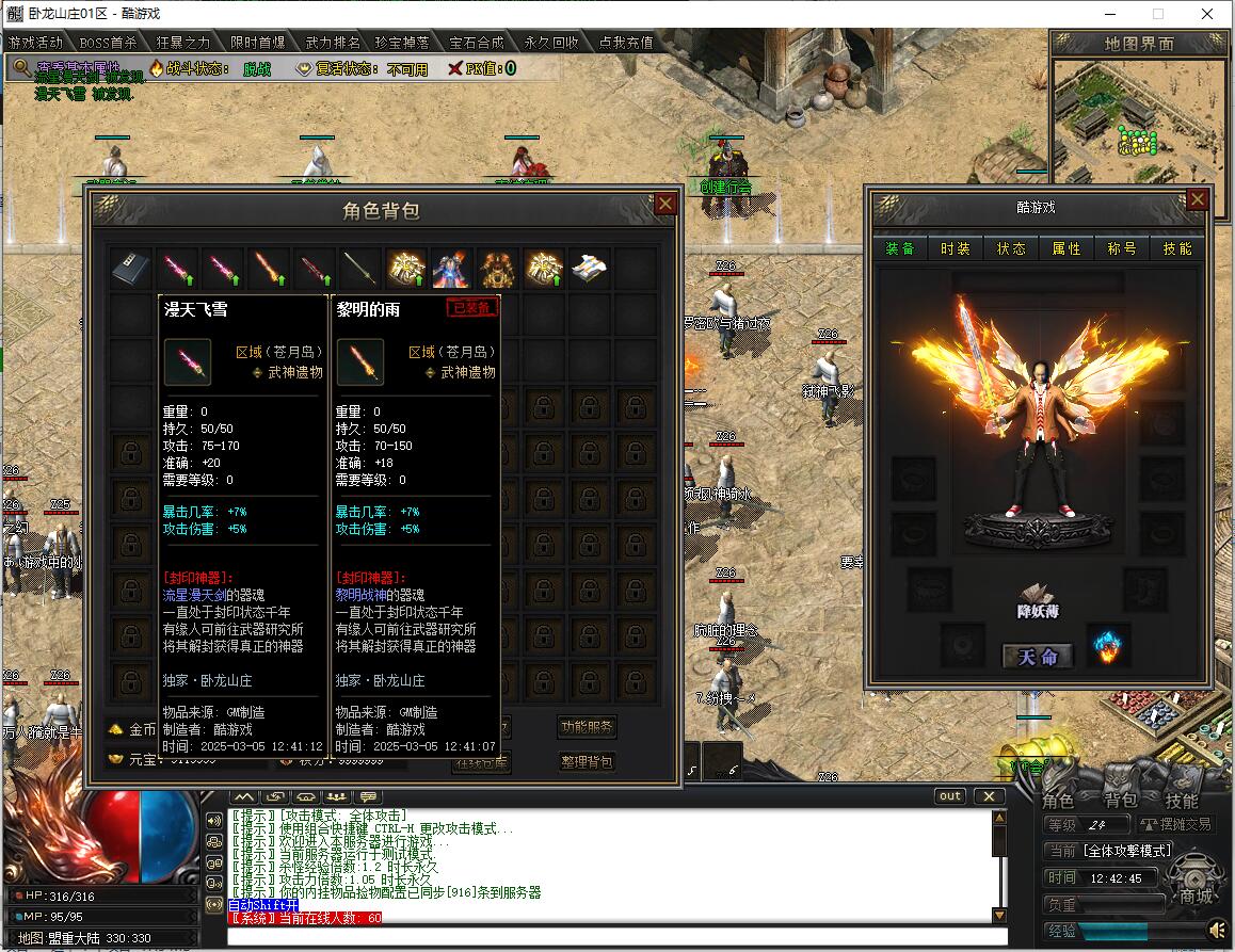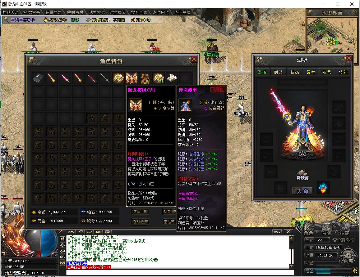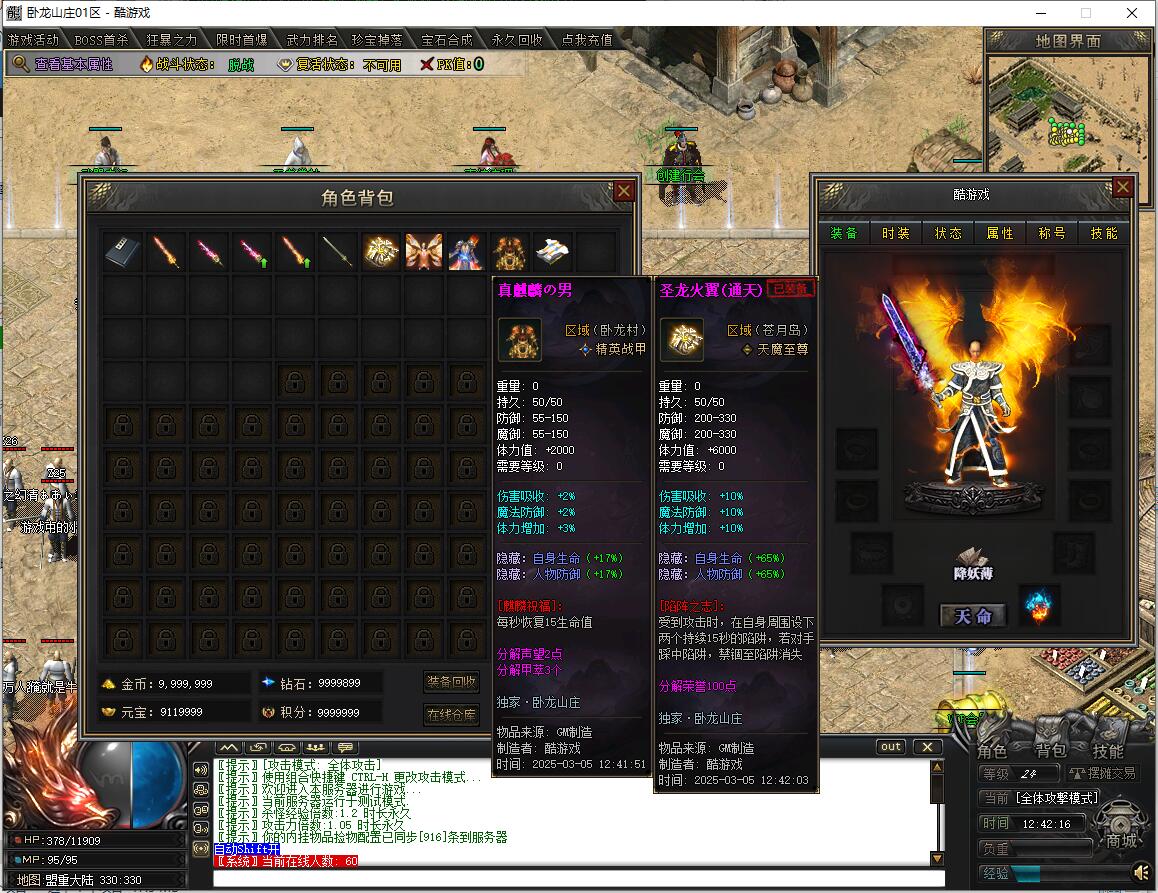 传奇游戏最新版本更新:新增智能挂机系统(入口位于综合服务内),优化所有怪物爆率(专属与材料爆率大幅提升),新增三个不爆物品,同步上线手写攻略(建议配合查询系统游玩,游戏难度适中)。增加元宝获取途径(杀怪即可获得元宝,适配后期高消耗需求),新增两个背包神器,调整金币获取规则(不同赞助等级对应不同获取量),金币回收倍率与赞助等级挂钩。修复3个剧情地图因不刷怪导致的中断问题,解决强化框不显示无法强化的故障,优化杀怪点变量及称号领取条件(一晚上可领完)。整理土城NPC布局(删除无用NPC,界面更整洁),新增GM可控真假爆率系统,优化人物初始攻速(非无限刀)。完成多处剧情地图问题修复与优化:赤沙龙城材料调整;剧情二四个NPC货币消耗、材料及概率优化(适配周服节奏);剧情三老者/尊者材料数量与成功率优化、老马猴/卖酒老头/定海神针合成修改、震天凯/穿针引线合成问题修复;云顶天宫进图条件调整,难度适当降低。