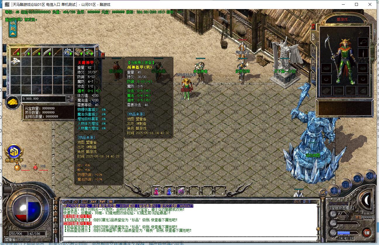 10. 本服武器屠龙终极(屠龙殿产出),首饰雷霆装备(蛮荒部落产出),42级衣服终极(蛮荒部落产出),35级技能(尸王殿产出),42级技能及护体神盾(蛮荒部落产出)靠怪物爆