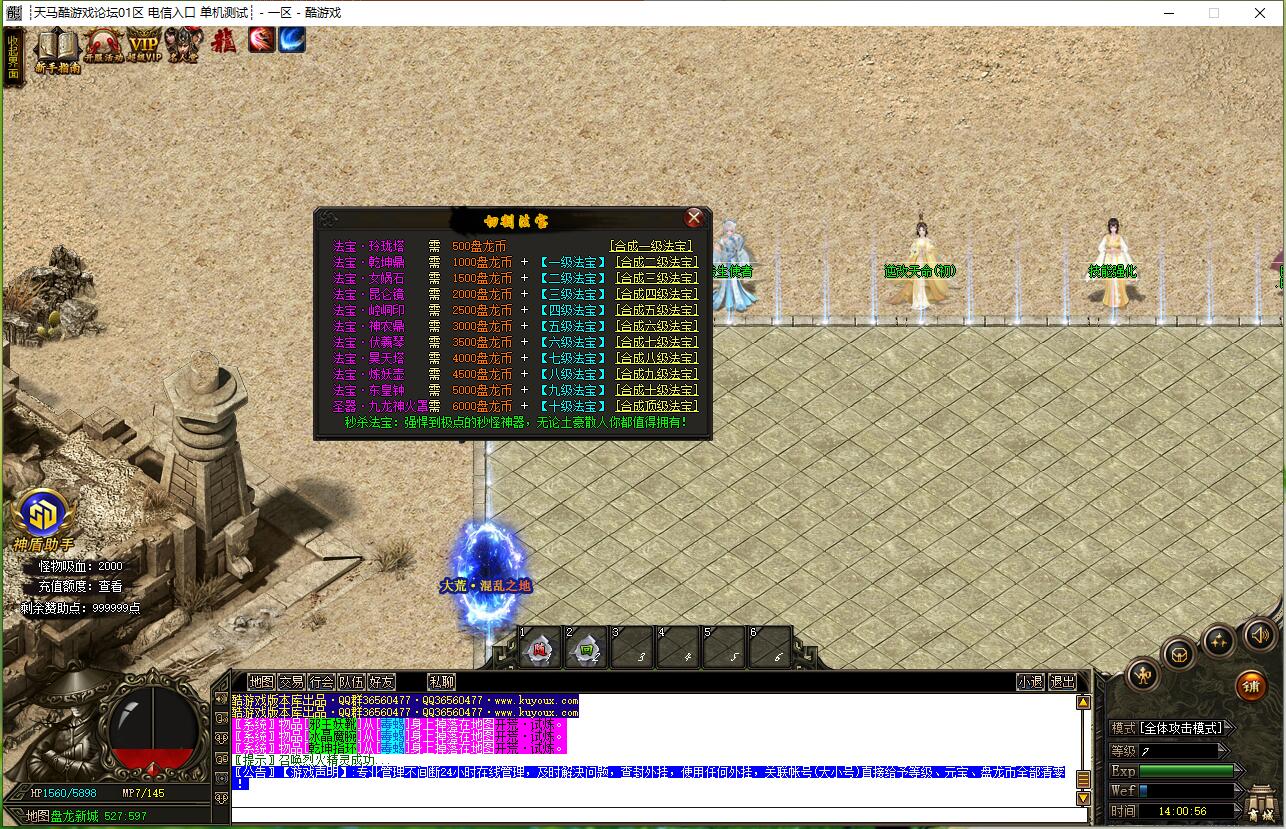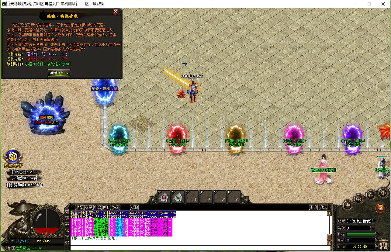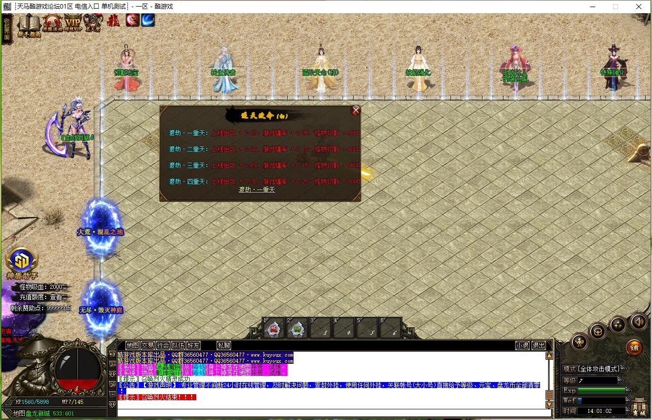 本服务器特色:杀戮三层20修仙,终极称号地图爆率极佳。只需10RMB点开启狂暴模式,获得打怪爆率1.1倍、100万血重加成、1.2倍攻击。