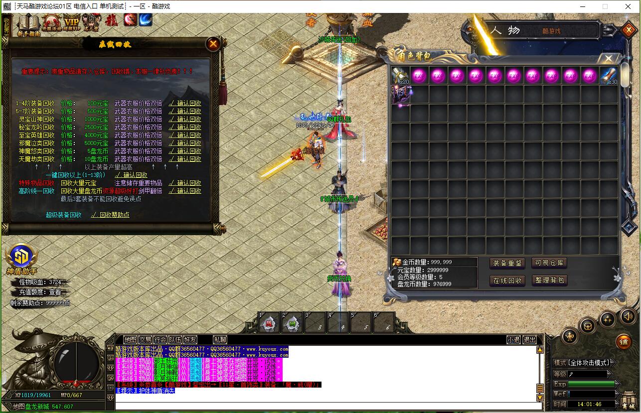 本服还原干净聊天框,无垃圾信息及回收提示,商铺不售材料全靠打怪,永久回收物品均由怪物爆出。游戏问题可QQ群联系客服完美解答,无论是否消费均用心服务,所有玩家公平对待。交易安全需通过商铺RMB点交易,提现手续费仅10%;私下交易一经查实封号并清除提现记录;禁止自动刷屏、骂人小号占安全区,违者警告或封号;严禁加速脱机外挂,发现必删永不解封。