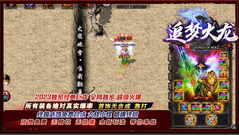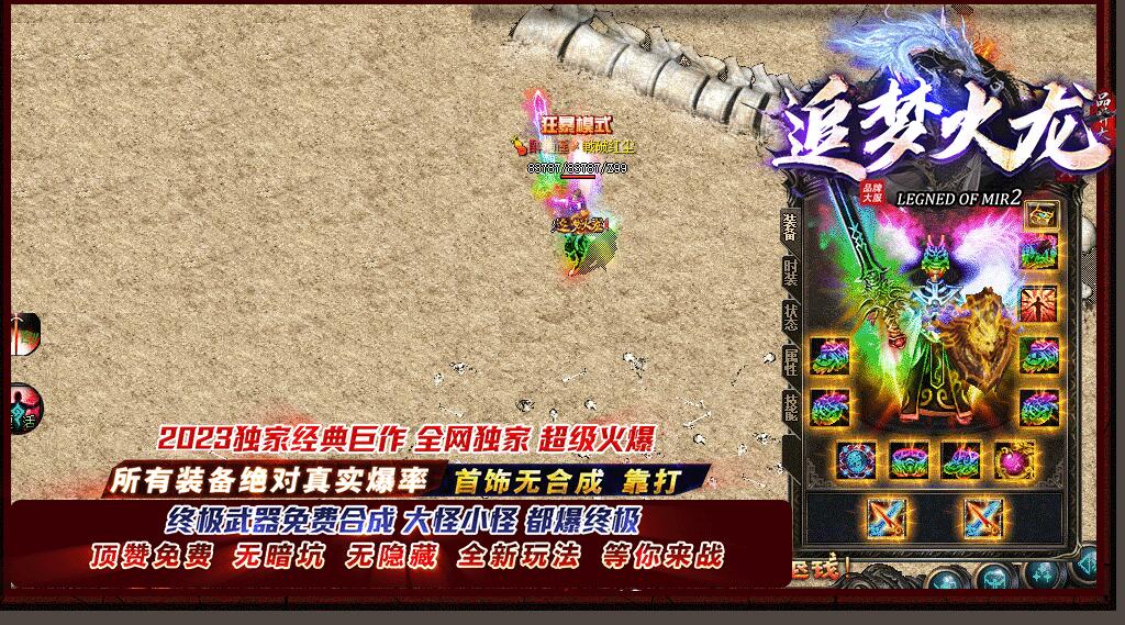 全民火龙单职业微变版本,纯散人服不花钱也可终极,一切靠打无合成,散人打金地图多怪物刷新速度快,装备货币保值,每日人品大爆发轻松300+收入。每天稳定四区开放(10:30 14:30 18:30 22:30),每个地图终极福利BOSS每晚22:01刷新,首区攻沙奖励RMB 588无封顶。市场最强封挂系统24小时接受举报,提醒设置二级密码防扫号。适度游戏益脑,拒绝盗版,享受健康生活。