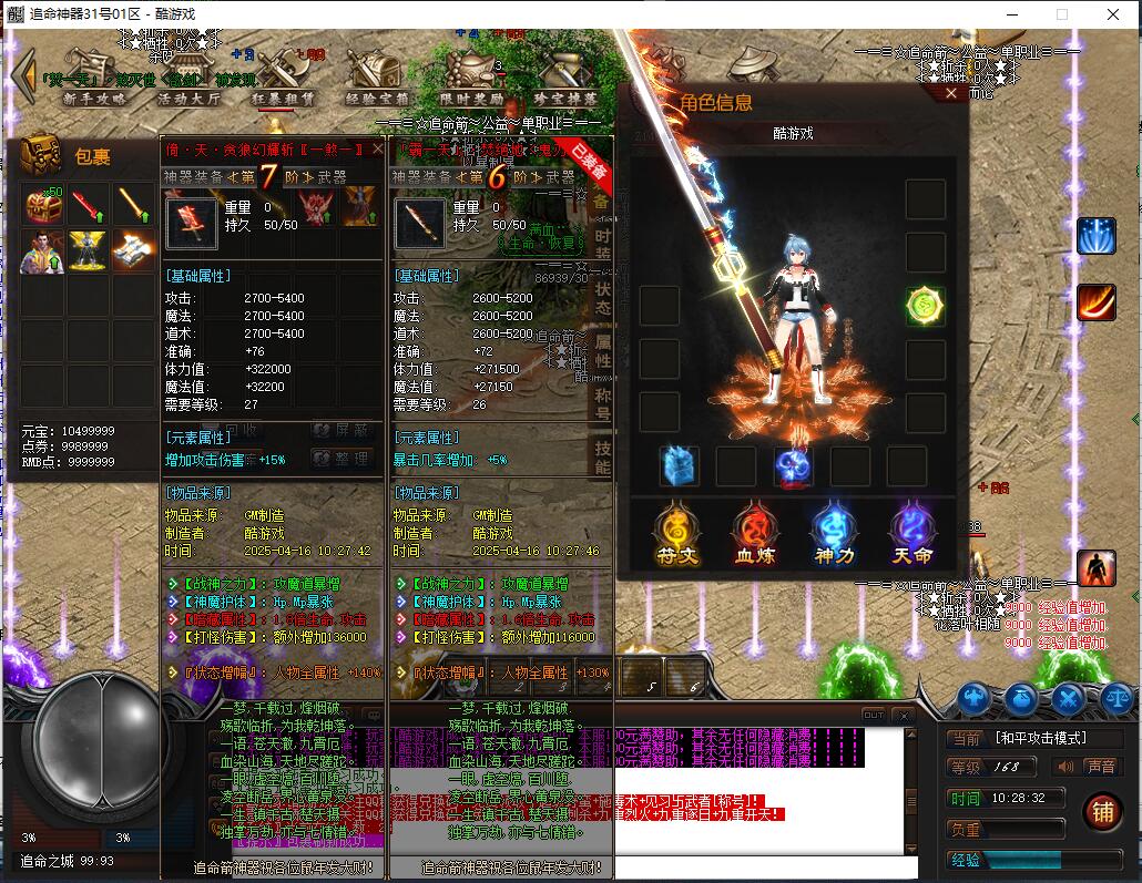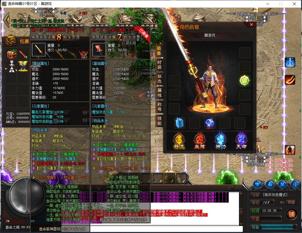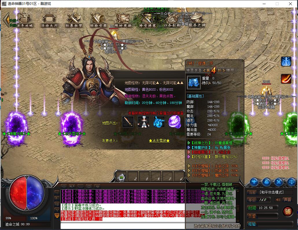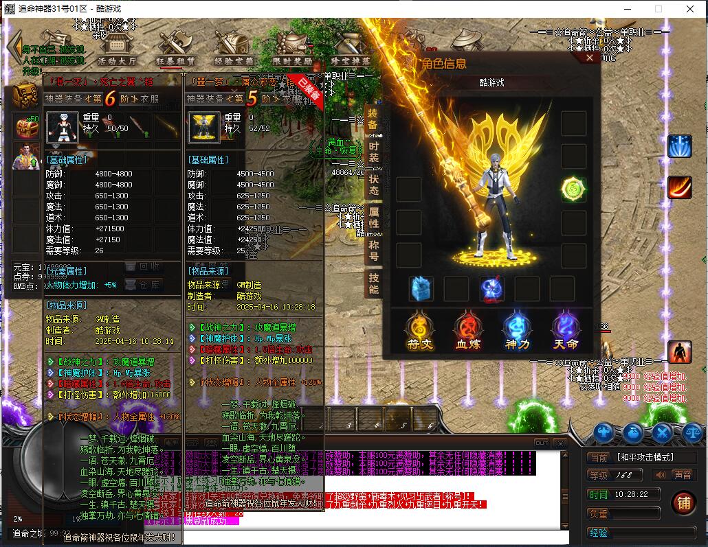 《神魔战场》是一款充满热血与激情的传奇游戏,元神系统作为核心特色玩法,拥有强大耐玩性与探索性,是散人玩家逆袭高富帅的快捷之路。游戏包含元神系统(青龙、白虎、朱雀、玄武元神,满级120级,玄武元神可学阴阳召唤召唤同步属性宝宝,材料靠打怪大量爆出自动食用)、人物神力·坐骑系统(满级坐骑倍攻+20%、爆率+40%、伤害+20%,9级带传送,灵魂宝石与元宝靠打怪)、强力元素·称号系统(满级称号攻+10%、体力+10%、魔力+10%、致命+10%、暴击抗+10%,顶级激活护体神盾,材料靠打怪),以及泰亚史诗特色玩法(幸运最高12激活刀刀最高攻击,武器准确+30,前100级经验卷打怪,后120级埋没之城副本,青铜赞助以上可紫装鉴定)。长期玩法耐玩,助玩家在神魔战场脱颖而出。