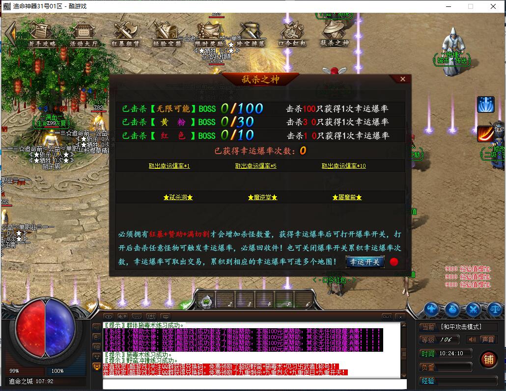 传奇游戏最新版本更新:新增智能挂机系统(入口位于综合服务内),优化所有怪物爆率(专属与材料爆率大幅提升),新增三个不爆物品,同步上线手写攻略(建议配合查询系统游玩,游戏难度适中)。增加元宝获取途径(杀怪即可获得元宝,适配后期高消耗需求),新增两个背包神器,调整金币获取规则(不同赞助等级对应不同获取量),金币回收倍率与赞助等级挂钩。修复3个剧情地图因不刷怪导致的中断问题,解决强化框不显示无法强化的故障,优化杀怪点变量及称号领取条件(一晚上可领完)。整理土城NPC布局(删除无用NPC,界面更整洁),新增GM可控真假爆率系统,优化人物初始攻速(非无限刀)。完成多处剧情地图问题修复与优化:赤沙龙城材料调整;剧情二四个NPC货币消耗、材料及概率优化(适配周服节奏);剧情三老者/尊者材料数量与成功率优化、老马猴/卖酒老头/定海神针合成修改、震天凯/穿针引线合成问题修复;云顶天宫进图条件调整,难度适当降低。