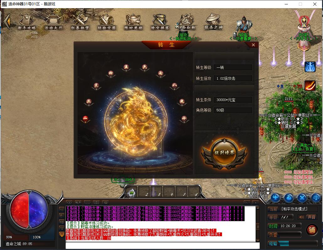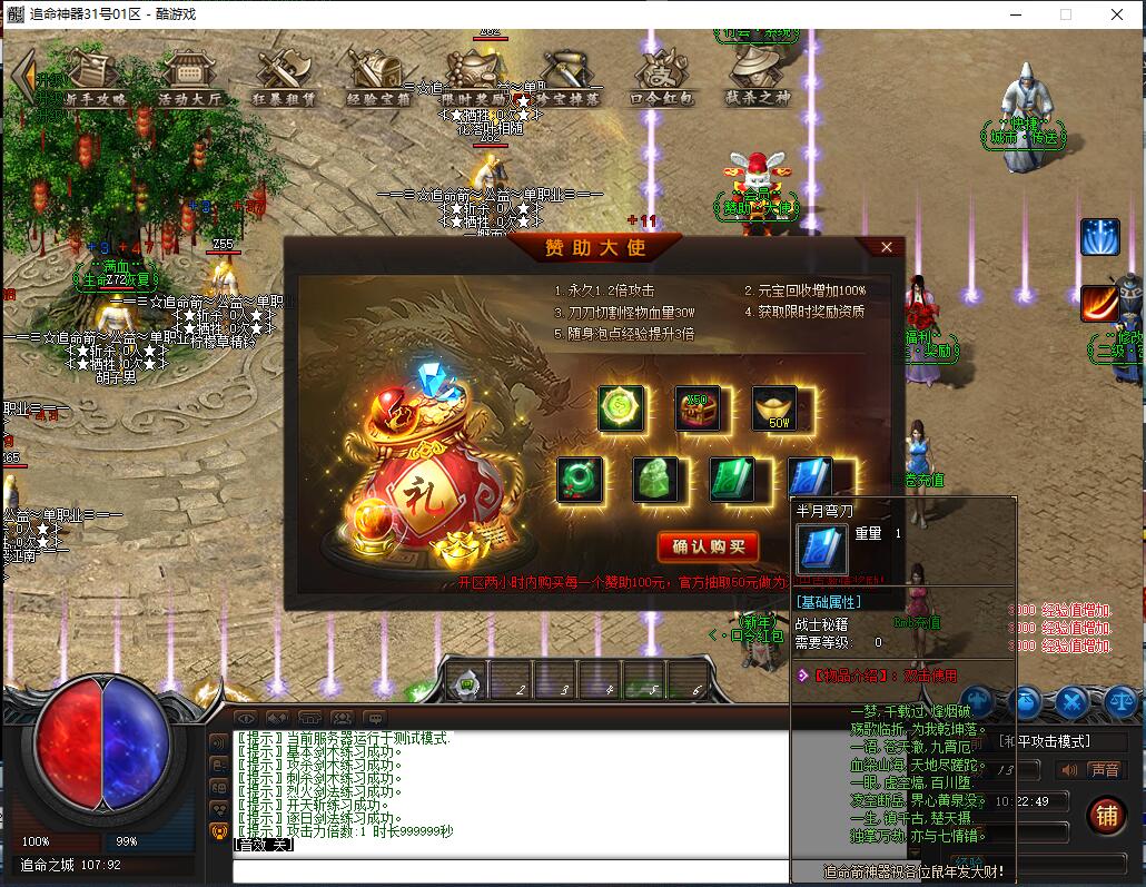 攻城奖励:玩家每一个赞助100元,官方抽取50元做为沙巴克激情奖励