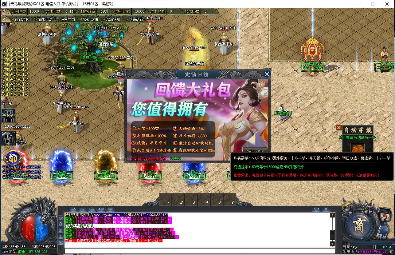 本服还原干净聊天框,无垃圾信息及回收提示,商铺不售材料全靠打怪,永久回收物品均由怪物爆出。游戏问题可QQ群联系客服完美解答,无论是否消费均用心服务,所有玩家公平对待。交易安全需通过商铺RMB点交易,提现手续费仅10%;私下交易一经查实封号并清除提现记录;禁止自动刷屏、骂人小号占安全区,违者警告或封号;严禁加速脱机外挂,发现必删永不解封。