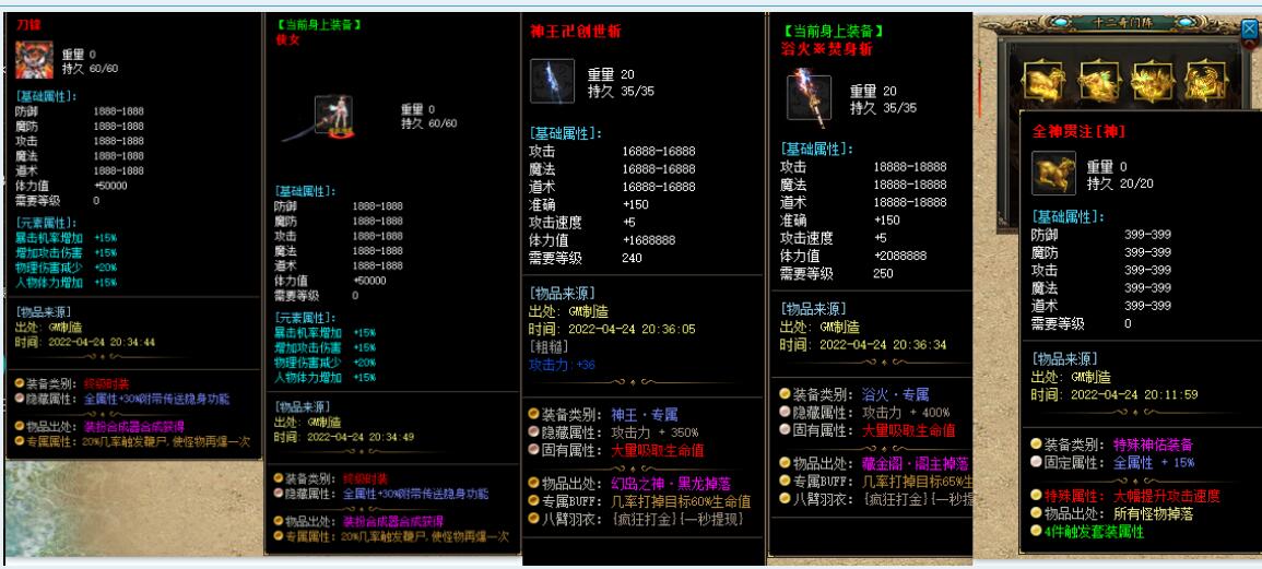 普通装备35套,特殊套装9套.神器5套.单件特殊神器27件(无任何合成)