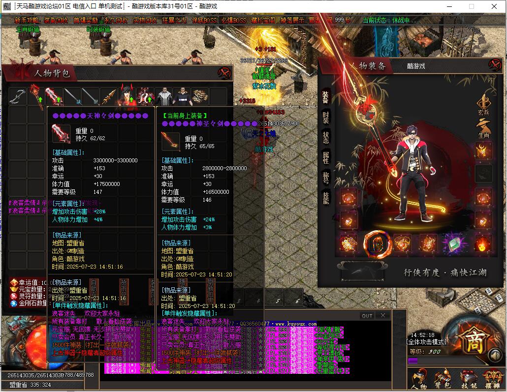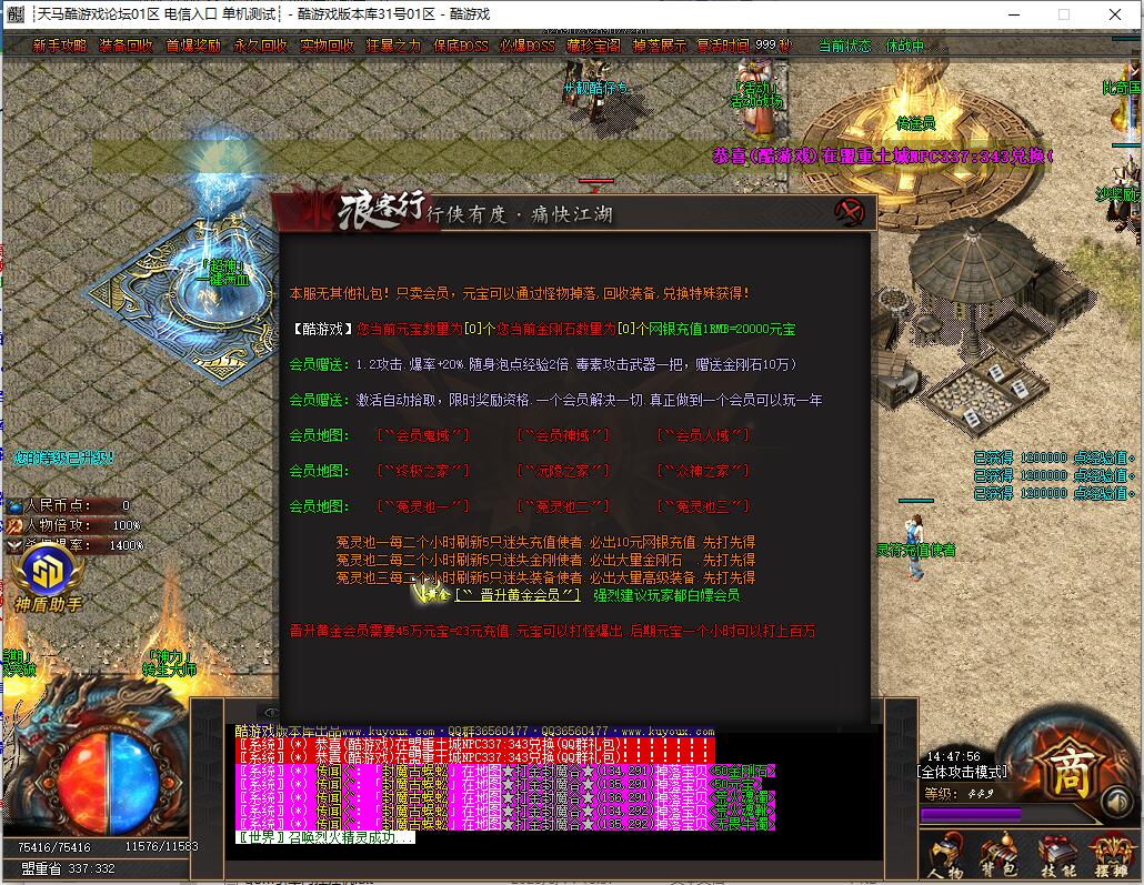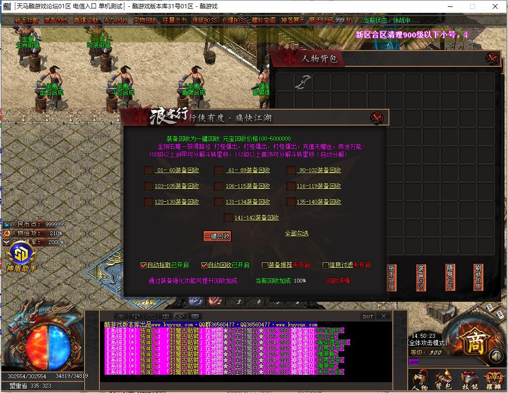 本服还原干净聊天框,无垃圾信息及回收提示,商铺不售材料全靠打怪,永久回收物品均由怪物爆出。游戏问题可QQ群联系客服完美解答,无论是否消费均用心服务,所有玩家公平对待。交易安全需通过商铺RMB点交易,提现手续费仅10%;私下交易一经查实封号并清除提现记录;禁止自动刷屏、骂人小号占安全区,违者警告或封号;严禁加速脱机外挂,发现必删永不解封。