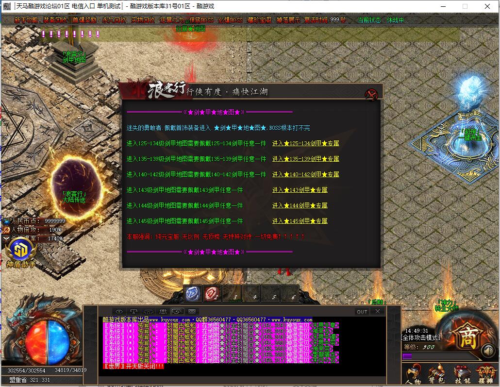 2021全新独家1.76剑雨传奇,极品+5装备全靠打,三职业平衡法神超嗨战士超狂道士超叼!充值比例1元=10000元宝+100积分+1金刚石(网银赠送100%),自助充值无优惠渠道。爆率全开装备永久保值回收,不分新区老区永不打折掉价,BOSS爆全服装备材料。55级召2虎王、60级召2白虎神王、65级召3白虎神王、70级召3白虎魔王、75级召3飞龙圣兽,地图多BOSS多不抢怪。新区第二天下午合区,晚上8点激情攻沙首沙奖励188-588,后期合区有奖励。最新GK插件100%封外挂,绿色游戏装备技能精密调整PK平衡。每天多新区重金广告宣传,不乱合区保障发展,花钱有保障。注册设密码保护防盗号,十年传奇梦回忆兄弟情,打造长期稳定品牌大服。
