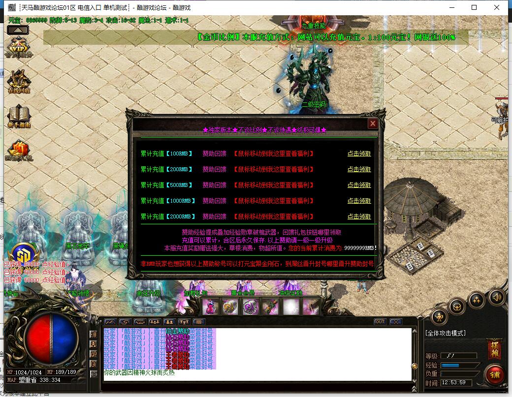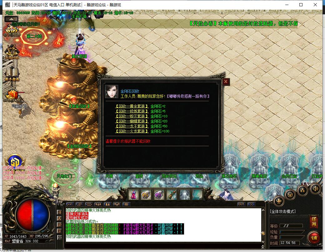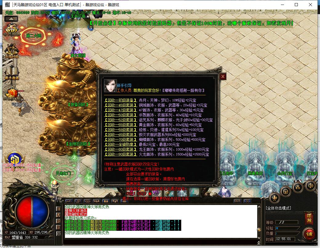本服还原干净聊天框,无垃圾信息及回收提示,商铺不售材料全靠打怪,永久回收物品均由怪物爆出。游戏问题可QQ群联系客服完美解答,无论是否消费均用心服务,所有玩家公平对待。交易安全需通过商铺RMB点交易,提现手续费仅10%;私下交易一经查实封号并清除提现记录;禁止自动刷屏、骂人小号占安全区,违者警告或封号;严禁加速脱机外挂,发现必删永不解封。