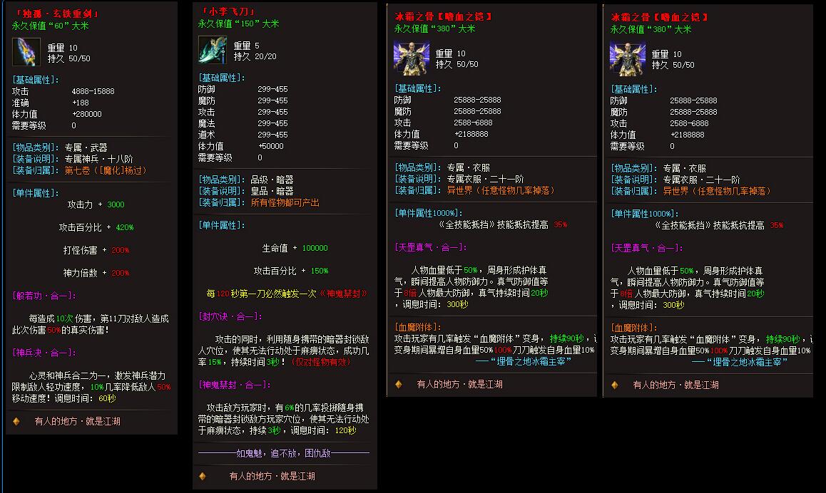 - 土豪玩法: 294元档 (242天劫币冲值+52大米充值) → (会员+沙捐+狂暴), 「斗笠」·戦八方 + 宠物·狐儿 + 上古魂环·「血海无涯」【Max】 (攻魔道 + 300%, 气血魔法 + 300%, 打怪加成 + 300%, 人物爆率 + 1500%, 附带传送功能)
