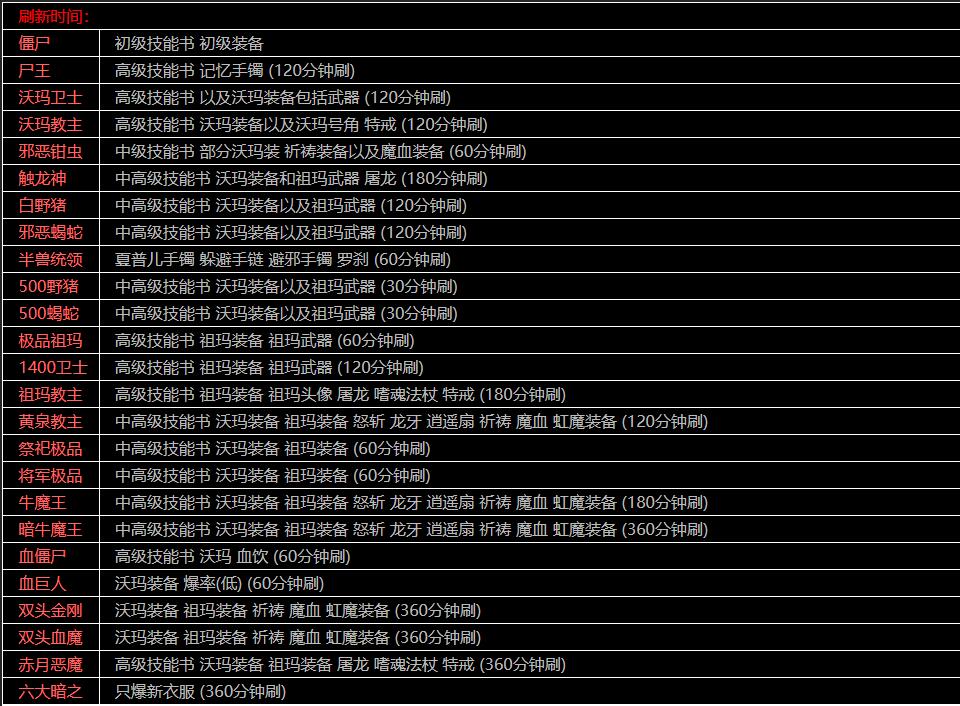设置6:F12更新了内挂、无自动放药,吃药有间隔、负重了就会走太空步、有自动练功和隐藏尸体。无智能半月、有自动寻路,全部地图靠跑,传送员只能传送安全区、商店只卖基本装备、道士毒药需要手动炼。不是每个商店都有特修功能,法师和道士的宝宝强度都跟自身属性有直接关系。技能等级也有很大影响,0级召唤骷髅和3级召唤骷髅所召出来的骷髅,在速度方面完全不是一个概念。特殊修理的价格是普修的10倍(新人不用担心这个问题,捡到啥装备就穿啥装备,没必要特修)。