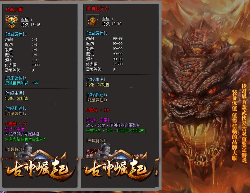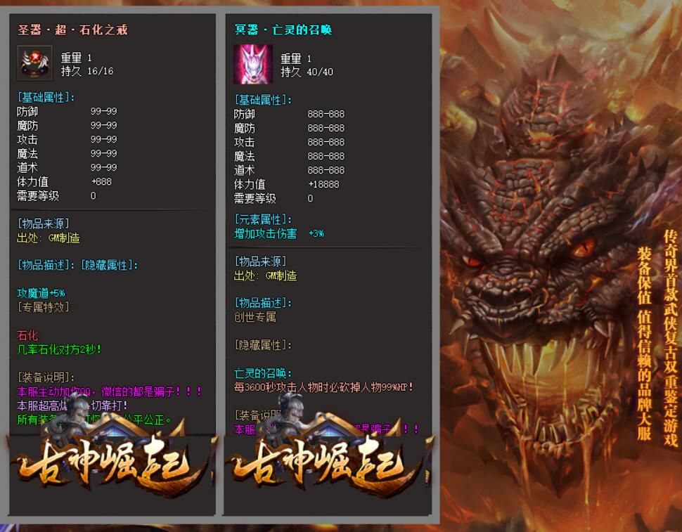 护符等装备出处:随机宝物奇遇会将玩家传送到指定地图,怪物必爆护符。护符需在土城左下角解封后方可佩戴,可通过炼魂值升级护符的BUFF技能等级和威力。装备品阶分为“弱小-微弱-强壮-强盛-残忍-残暴-弑佛-弑神-苍穹-混沌”,后期装备名如“星王-狂雷-逆火-王者-金牛-炎龙-天龙-雷炎-虎威-凤舞-荣耀-灵月-龙威-神工-神月-天极-神极-极乐-天下-帝国”。装备暴率:怪物越强,爆出高品阶装备的暴率越高(如普通怪物100只爆1个,混沌品阶10只爆1个)。微弱以上装备可在土城NPC合成高级品阶,装备可在土左下元素鉴定处进行2次鉴定,或在土左上角镶嵌技能以增强威力。