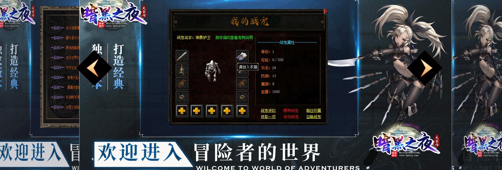 起号即送一级战宠,它将成为你忠实的战斗伙伴。你可以根据需要升级战宠,并为它装备适合的装备。请注意,战宠只能穿戴与其主人相同职业的装备,并且极品装备对其无效。打BOSS时,有机会获得宠物技能书,将技能书拖到加号上即可学习新技能。战宠的进阶不会影响已学习的技能,技能也可以随时替换或取下。