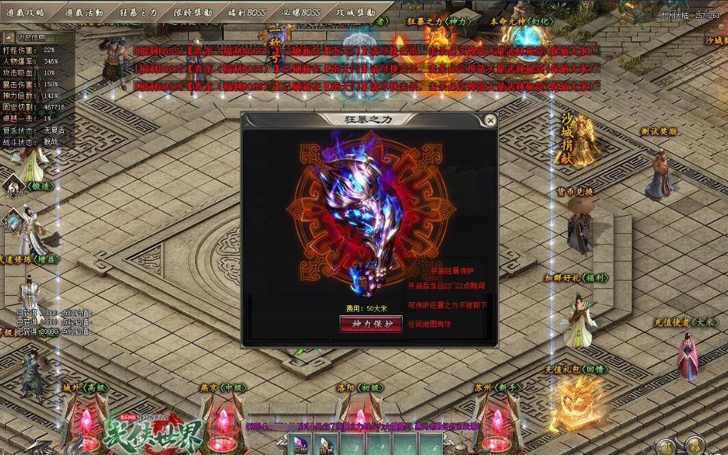 - 5元狂暴之力:获得超级属性、激活十步一杀、免费挂机。