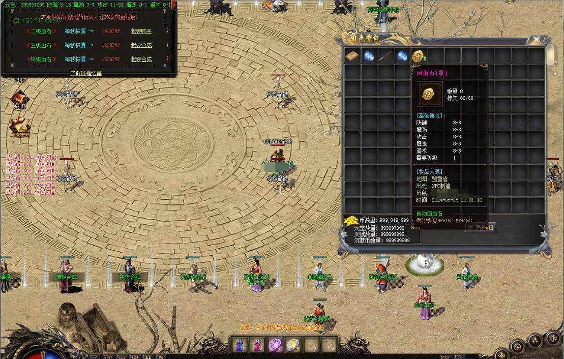 沙捐3000元宝,狂暴600元宝,回血石根据自己腰包提升。终极血石一共用2000元宝(沙捐+狂暴+血石=56元)。血石合成在土城右下角查看。前期打到经验碎片在辅料合成合成三倍勋章,每次合成用100元宝。土豪可直接合一个破棺结晶,攻击高带暴击和伤害增加百分百,还有血量提升。