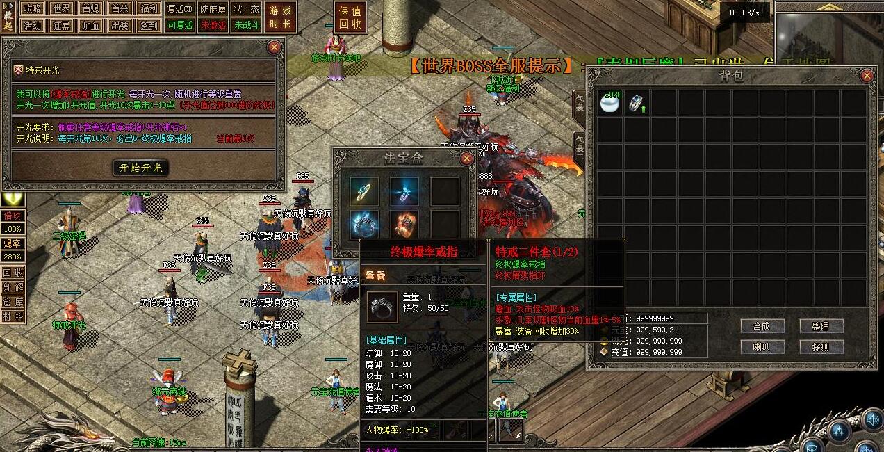领取礼包并锻造装备后,打开F9喇叭功能收材料,二大陆施展才华。装备淬炼至完美以上,进入神之领域地图。终极屠戮戒指和爆率戒指有套装属性,配合高级攻速吸血武器无伤打BOSS。升级去双倍幻境,保留五倍经验卷(所有怪物爆出)。红色满珠子别吃,留后期突破等级和职业分支。前期守尸王殿,15分钟刷新一波怪,超高几率掉书页,金币好打,用月卡、季卡、年卡来回打够书页和金币,学高级技能。